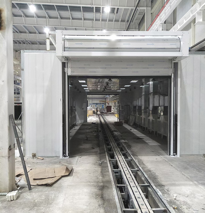 門簾材質(zhì):門簾為分體裝配結(jié)構(gòu)設(shè)計(jì),采用加厚型彩鋼門板、不銹鋼門板及鋁合金門板,多層次密封膠條,消音承重鉸鏈,聚氨酯導(dǎo)向輪等幾個(gè)部分組成。厚度為40mm,表面經(jīng)過(guò)陽(yáng)極氧化加有機(jī)著色處理,中間為聚氨酯發(fā)泡的硬質(zhì)復(fù)合板;可選顏色鋁合金及不銹鋼原色、深灰色、峨眉灰、土豪金香檳色等多種顏色門板間通過(guò)軟連接膠條進(jìn)行密封,軟連接部分折疊壽命達(dá)百萬(wàn)次以上。鉸鏈承重方式設(shè)計(jì)使門簾接合處不受力,門板之間不接觸,長(zhǎng)時(shí)間后還可保持平整性。